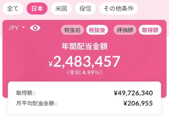日本株配当金額:2,483,457円(税引き後) 2025年10月31日時点
