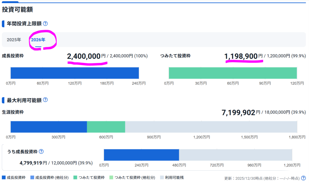 無事12/30に買付が完了し、2026年枠は残すところあと1,100円のみ。