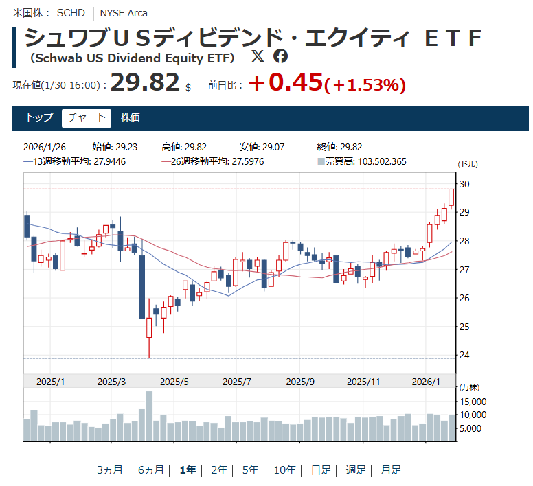 本家のSCHD指数は、1月後半も絶好調のようです。